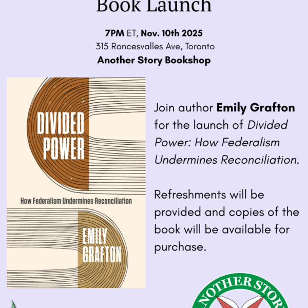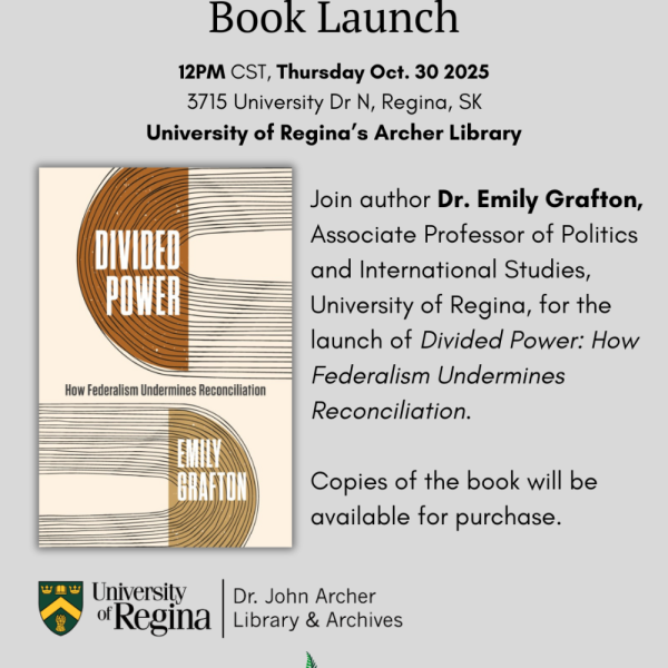 Join author Dr. Emily Grafton, Associate Professor of Politics and International Studies, University of Regina, for the launch of Divided Power: How Federalism Undermines Reconciliation.