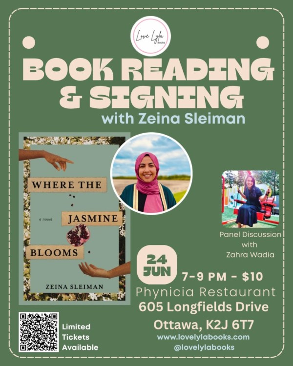 Join debut author Zeina Sleiman for an Ottawa reading of her novel Where the Jasmine Blooms. The reading will be followed by a book signing. Registration is required and tickets are available through Love Lyla Books. Zeina will be joined in conversation by Zahra Wadia.