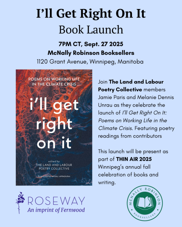 Join The Land and Labour Poetry Collective members Jamie Paris and Melanie Dennis Unrau as they celebrate the launch of I’ll Get Right On It: Poems on Working Life in the Climate Crisis. Featuring poetry readings from contributors