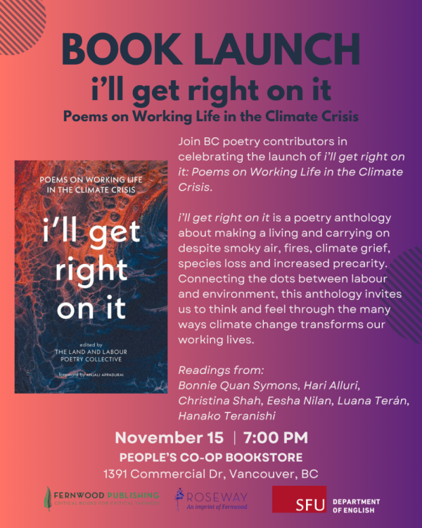 Join BC contributors in celebrating the launch of I'll Get Right On It: Poems on Working Life in the Climate Crisis.
