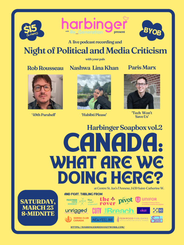 Come hangout with Harbinger Media friends as they dig deep into the sorry state of Canadian media, journalism and politics! Join Rob Rousseau (49th Parahell), Nashwa Lina Khan (Habibti Please), and Paris Marx (Tech Won't Save Us) on Saturday, March 23rd, 8pm at the historic Centre St. Jax basement venue l'Annexe located at1439 rue Saint-Catherine Ouest next to Concordia University in downtown Montreal.