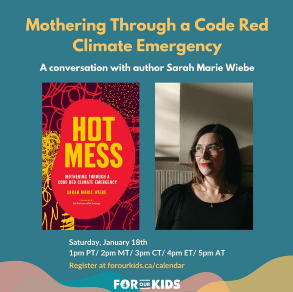 Join For Our Kids for an online conversation with author and scholar Sarah Marie Wiebe as we discuss her latest book, Hot Mess: Mothering Through a Code Red Climate Emergency.
