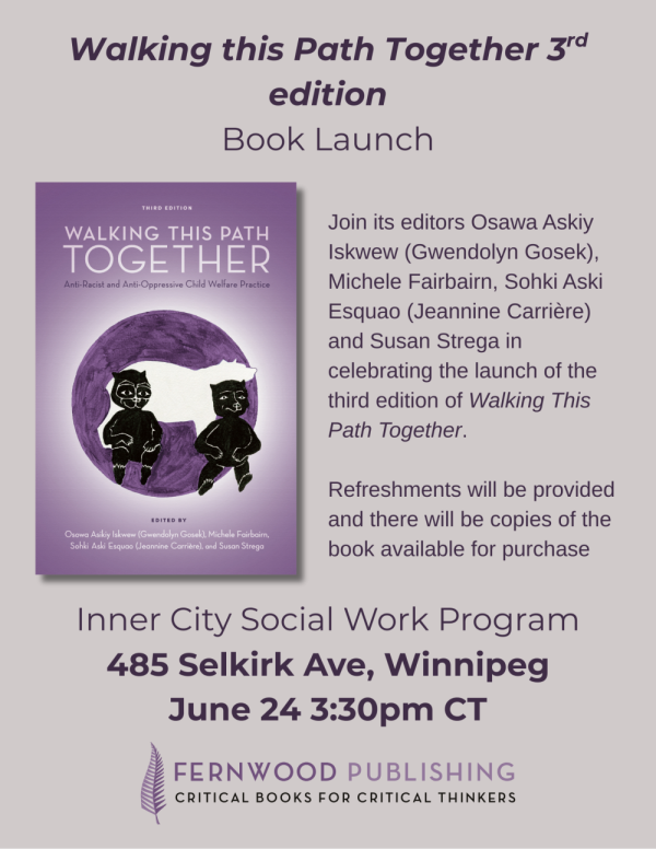 Join its editors Osawa Askiy Iskwew (Gwendolyn Gosek), Michele Fairbairn, Sohki Aski Esquao (Jeannine Carrière) and Susan Strega in celebrating the launch of the third edition of Walking This Path Together.